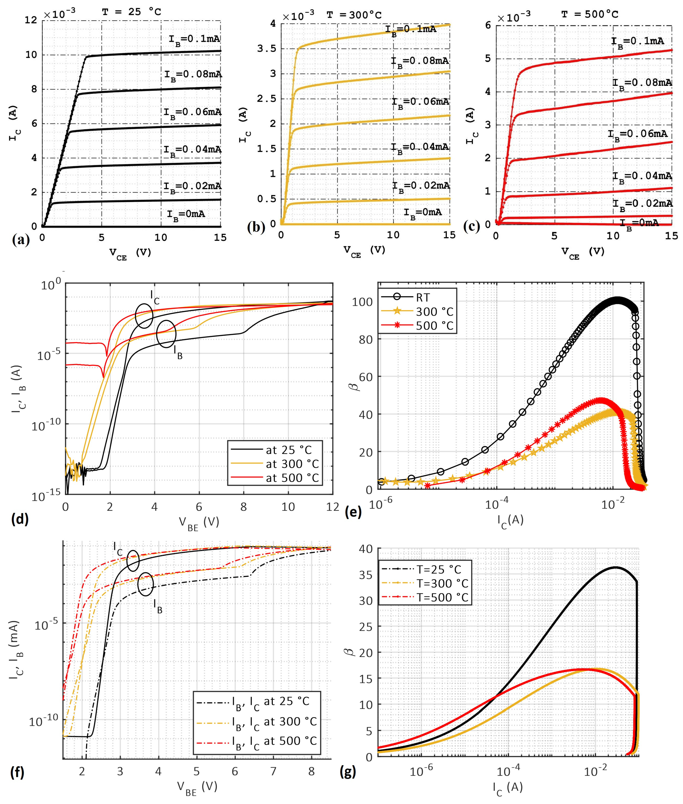 - Tian, Y.; Hedayati, R.; Zetterling, C.M. SiC BJT Compact DC Model With Continuous- Temperature Scalability From 300 to 773 K. IEEE Trans. Electron Devices 2017, 64. [Google Scholar] [CrossRef]