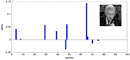 SPP adopts sparse representation as a way to automatically construct adjacent graphs which overcomes the limitation of artificially constructing adjacent graphs in the traditional manifold learning. It seeks the optimal low-dimensional subspace by maintaining the reconstruction relationship between and obtained in the high-dimensional sample space. However, due to the complexity of unconstrained face images, the neighborhood reconstruction relationship residing in adjacent graph via SPP algorithm is not accurate. Figure 1 gives an example on the LFW database [46]. We randomly select one sample as and the remaining 99 samples as . The corresponding reconstruction weight of is calculated by Equation (5). As shown in the Figure 1, there are 100 samples participating in the reconstruction of , where the first 10 samples possess the same class label as and the remaining 90 samples have different ones. It can be seen that the reconstruction weights of some samples with different labels as are fairly large, such as the 29th, 39th, 48th and 65th samples, while the reconstruction weights of other samples with the same label as are zeros except for 4th and 8th. It means that the adjacent graph of SPP neglects some intra-class samples which are non-neighbor due to the interference of unpredictable factors in the same subject, and has the potential to connect a few inter-class samples which are pseudo-neighbor in view of similar face compositions in different subjects.