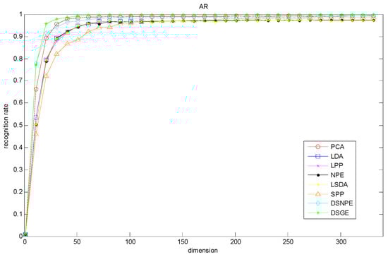 Experiment 1: First, for proving the effectiveness of DSGE against the interference of illumination with different degrees on the Extended Yale B database, we randomly selected N images of each individual as training samples, and the remaining 64–N images were used as test samples. In this experiment, the value of N is 10, 20 or 30. In order to facilitate the comparison with the state-of-the-art algorithm named GRSDA [41], we adopted the nearest neighbor classifier with the identical settings as GRSDA to conduct experiments. The best recognition rate of each method and the corresponding dimension are listed in Table 4. It should be noted that the experimental results of methods except for DSGE in Table 4 are all cited from Ref [41]. From it, we observed that whether the number of training samples is 10, 20 or 30, DSGE was always superior to the other methods and it outperformed GRSDA by 6.58%, 6.25% and 4.79% respectively. This demonstrates that the proposed DSGE has the ability of eliminating the interference of light change and is insensitive to the number of training samples.