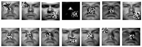 Experiment 2: For further demonstrating the effectiveness of DSGE against occlusion on the Extended Yale B database, we randomly selected 14 images of each individual and added noise occlusion block with black and white dots with random distribution. The location of noise occlusion block was random and the ratio of size between noise occlusion block and original image was also random where the ratio parameter ranged from 0.05 to 0.15. Some occlusion samples of one person are depicted in Figure 6. In this section, we did the following experiments by two cases. (1) We randomly selected 32 images per person which included 14 images with noise occlusion block, and the remaining images for testing. (2) We randomly selected 32 images per person which contained seven images with noise occlusion block, and the remaining images for testing. All experiments in each case were conducted by 1NN classifier and SVM classifier respectively, and were repeated 10 times. The experimental results are shown in Table 5. From it, we observed that despite the location and size of noise occlusion block in facial images being random, the performance of DSGE was still not affected. By using the 1NN classifier and SVM classifier in the first case, the average accuracy and standard deviation of DSGE were 94.84 ± 1.82% and 95.96 ± 0.87%, respectively, which ranked the highest. When reducing the number of occlusion images, such as in case two, the recognition accuracy of DSGE also increased and still preserved optimal performance. Therefore, DSGE had the superior capacity against the interference of occlusion block whether on the 1NN classifier or SVM classifier.