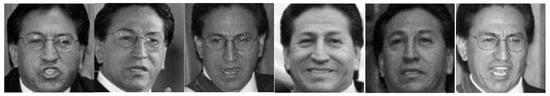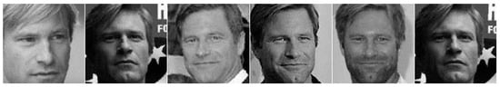 The Labeled Faces in the Wild database (LFW database) [46] is a challenging unconstrained face database which is collected from the Internet. It has a total of 13,233 facial images from 5749 different individuals, of which 4069 individuals only have a single image. To perform face recognition, in this section we constructed a new subset by gathering the subjects which had more than 20 samples from the original LFW database. The new subset had a total of 3023 facial images. Since these images are taken in completely real environments with non-cooperative subjects, there were complex backgrounds and some non-target subjects in the captured images. We adopted the face detection algorithm proposed in [58] to remove the interference of background and non-target subjects and croped images into 128 × 128 pixels. Some samples of one person are illustrated in Figure 7.