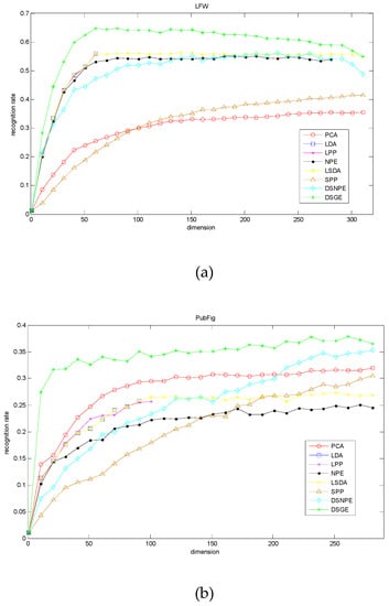 Experiment 1: We adopted PCA [10], LDA [11], NPE [23], LSDA [59], SPP [33], DSNPE [30] and our proposed DSGE for dimension reduction and exploit the SRC classifier for recognition. The recognition rate curve of each method versus the variation of dimensions is presented in Figure 9, and Table 6 lists the optimum accuracy of each method and the corresponding dimension. From them, we made observations that DSGE was always superior to the other methods regardless of the variation of dimension. More precisely, on the basis of the optimal dimension, the maximal recognition rates of DSGE on the LFW database and PubFig database were 64.84% and 37.88% respectively. It outperformed the second-placed LSDA (or LPP) by 8.54% on the LFW database, and surpassed the second-placed DSNPE by 3.53% on the PubFig database. Thus it can be seen that the performance of DSGE was not influenced by the variations of dimension and has absolute advantage in characterizing the discriminative manifold structure of unconstrained face images which are collected from completely real environments.