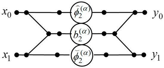 Direct computation of (4) takes four multiplications and two additions of complex numbers. From the symmetry of the DFrFT matrix follows that for any value of the parameter , the matrix contains the same elements on the secondary diagonal. Therefore [17], the number of multiplications in the calculation of the two-point DFrFT can be reduced.