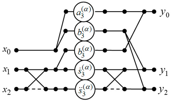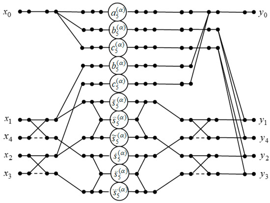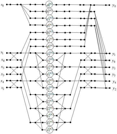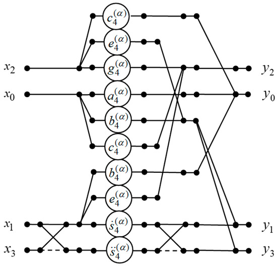 A decisive factor for applications of the various types of DFrFT has been the existence of fast algorithms for computing it. However, only DFrFT based on the eigenvalue decomposition [1,2,3] has all the properties which are required for DFrFT such as unitarity, additivity, reduction to discrete Fourier transform when the power is equal to 1, an approximation of the continuous FrFT [3]. We will call this type of DFrFT as “true” [13]. Fast algorithms for this type of transformation were described in papers [5,14]. The limited volume of these publications did not allow the presentation of all the details of the organization of the calculations for the specific lengths of the original data sequences. In particular, the fast algorithms and schemes for discrete orthogonal transformations for short lengths of input sequences are of practical interest. For example, in [15] the fast algorithms for small-size DFTs were presented. In [16], some schemes for small-size DHTs are given. In the case of DFrFT, such algorithms are not given anywhere. We want to eliminate this shortcoming. To this end, we present fast algorithms and processing unit structures to compute a true DFrFT for N = 2, 3, 4, 5, 6, and 7.