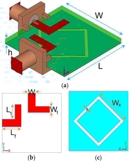 Its configuration contains a diamond-ring slot radiator with a pair of L-shaped microstrip feed lines. Parameter values of the designed antenna and its MIMO configuration are specified in Table 1. The motive behind the presented design is to achieve a dual-polarized wideband antenna with compact-size and capability of integration onto smartphone PCB. This has been achieved by using the diamond-ring slot antenna with L-shaped microstrip feed lines. The slot antenna is one type of printed antenna that has been investigated extensively for different wireless systems for several decades because of its attractive features including light-weight, compactness and ease of integration with radio frequency (RF) circuit [30]. The ring-slot antenna can excite two orthogonal polarization if it is fed differently [31]. This makes the printed-ring-slot antennas attractive. The resonant frequency of the antenna is mainly determined by the circumference length of the employed diamond-ring slot. Therefore, the circumference length of the diamond-ring slot needs to satisfy the dielectric wavelength at the corresponding frequency point, where Wx/2 + g = λ. However, the length of feed-line (Lf + L1) also has a little effect on the frequency point and impedance-bandwidth of the design.