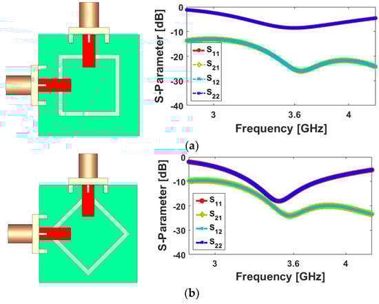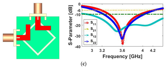 Configurations and S parameters of the square-ring slot with rectangular feed line, a diamond-ring slot with rectangular feed line, and the proposed diamond-ring slot radiator with L-shaped feed line are illustrated and compared in Figure 2a–c, respectively. It can be observed that by using the proposed design (Figure 2c), the antenna not only provides wider impedance bandwidth but it also exhibits high isolation with low mutual coupling characteristic (less than −20 dB) at the desired operation band. As shown, the operation frequency of the slot radiator with L-shaped feed lines spans from 3.2 to 4 GHz (800 MHz bandwidth). For S11 ≤ −6 dB, this value is 3–4.2 GHz.