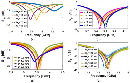 S11 results of the diamond-ring antenna for various values of (a) Wx, (b) L1, (c) x, and (d) W1.