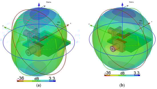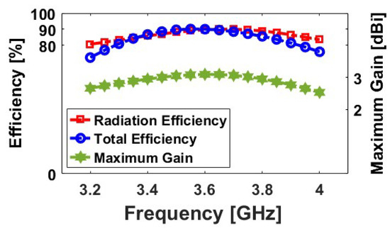 Figure 4 shows the surface current distributions in the ground plane of the antenna at 3.6 GHz. As shown, the surface currents are mainly distributed around the diamond-ring slot radiator. In addition, for the different feeding ports of the antenna, the currents densities are equal and opposite due to the polarization diversity function [32,33,34]. Figure 5 illustrates the 3D radiation patterns of the antenna when it is fed differently (Port 1 and Port 2). As seen, the antenna exhibits similar radiation patterns with different orthogonal polarizations and more than 3 dB realized-gain. Radiation characteristics of the dual-polarized diamond-ring slot antenna in terms of radiation efficiency, total efficiency, and maximum gain are illustrated in Figure 6. As seen, the antenna provides high efficiencies. More than 80% radiation and total efficiency properties are obtained over the entire operation band (3.2–4 GHz). It can be observed that the antenna exhibits almost similar radiation and total efficiency. In addition, the antenna has around 2.5 dBi directivity.
