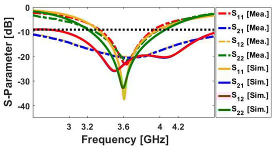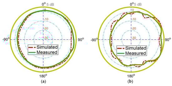 According to the point that the radiation elements with the same placements and polarizations provide similar radiation patterns, 2D polar radiation patterns of the adjacent resonators (including Ant. 1 and Ant. 2) were measured at center operating frequency (3.6 GHz) and illustrated in Figure 16. As shown, the sample prototype exhibits good radiation patterns and provides acceptable agreement with simulations. In addition, the antenna elements with different polarizations provide sufficient gain values at the center frequency of the operation band.