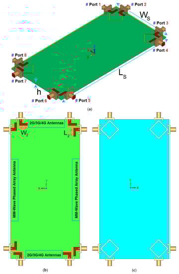 Among the antennas which are used for MIMO applications, printed antennas are more appropriate due to their low cost, easy fabrication and their capability of easily being integrated to small terminal devices [11]. However, placing multiple antennas in the limited space of a transceiver poses a significant challenge in the incorporation of the MIMO technique. According to the requirement of cellular communications, compact, wideband and high isolation MIMO antenna is an urgent demand in the future mobile terminal and the portable applications [12,13,14,15,16,17]. Recently, several techniques have been introduced to design massive MIMO antennas for 4G and sub-6 GHz 5G mobile terminals [18,19,20,21,22,23,24,25,26,27].