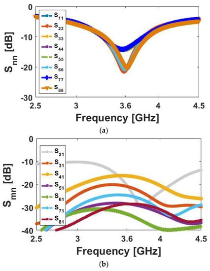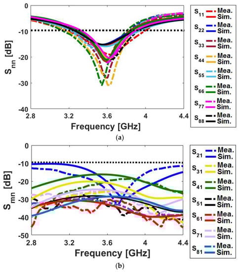 Measured and simulated (a) Snn (S11–S88) and (b) Smn (S21–S81) of the fabricated prototype.