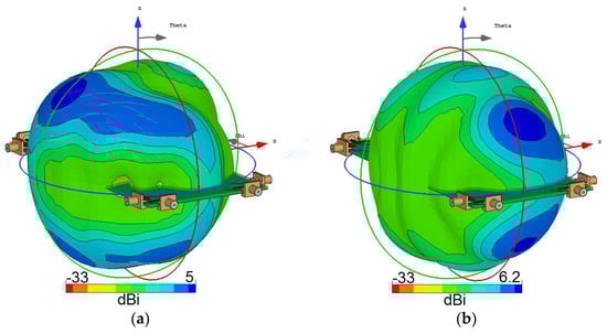 3D views of the dual-polarized radiation patterns from (a) feeding port 1 and (b) feeding port 2.