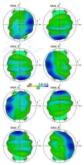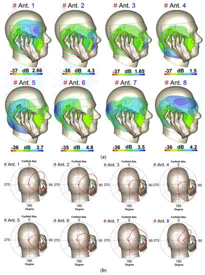 The maximum reductions of the radiation properties are observed for the elements that are located near to user-head (Ant. 3 and Ant. 4) [40]. However, the difference is not very significant. The 2D-polar (linear-scaling) radiation patterns of the design are illustrated in Figure 19b. As can be observed, the directivity of the antenna radiation pattern is maximum in the opposite direction of the head, which is most important part of the body to protect from the radiation. The main lobe of each single-element directs most of the power while the other lobes should be negligible.