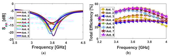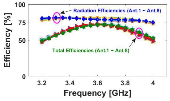 Efficiencies of the antenna elements (Ant. 1–Ant. 8) for the proposed design.