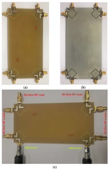 (a) Top, (b) bottom views of the fabricated design and (c) the prototype connected to the cables and 50-Ohm loads.