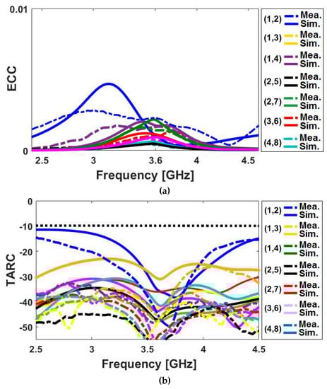 Calculated (a) envelope correlation coefficient (ECC) and (b) total active reflection coefficient (TARC) from measured S parameters.