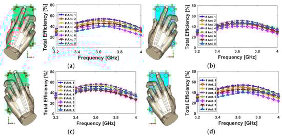 The impact of human-hand/human-head on the characteristics of the design in terms of total efficiency and antenna realized-gain were investigated in this section [37,38,39]. As illustrated in Figure 18, different scenarios including right-hand and left-hand modes for top-layer and back-layer of the design are studied in simulations. According to the obtained results, the mobile-phone antenna design and its radiators exhibit good performances and provide sufficient total efficiencies in the presence of the human hand. Due to the symmetric configuration of the proposed design, it performs almost similarly for different hand scenarios. The maximum reductions of the radiation properties are observed for the radiation elements partially covered by the user hand which is due to the nature of hand tissue properties which can highly absorb the radiation power. As can be observed, the antenna elements provide 25–55% total efficiencies over the operation band of 3.2–4 GHz.