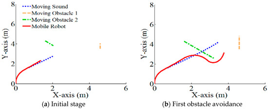 Figure 17 shows the experimental environment of multiple dynamic obstacle avoidance. The space was 6.0 m wide and 8.0 m long. The sound source was moving with a velocity of 300 mm/s, and was set as 720 mm/s, which was the same as the maximum velocity of the mobile robot.