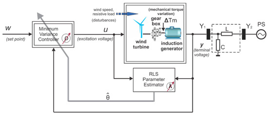 - Scherer, L.G.; Tambara, R.V.; Botterón, F.; Camargo, R.F.; Hilton, A.G. Discrete-time adaptive control applied to voltage regulation of induction generator based systems. In Proceedings of the 40th Annual Conference of the IEEE Industrial Electronics Society, Dallas, TX, USA, 29 October–1 November 2014; pp. 4940–4946. [Google Scholar] [CrossRef]