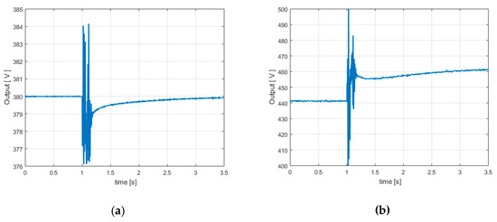 This new tests set considers an external disturbance (at time t = 1 s) produced by a resistive load () due to the connection of a new consumer. In all these case studies (see Table 1), for each of the three control law, the same values of the controller parameters (λ and ρ) were used as in previous cases (A).