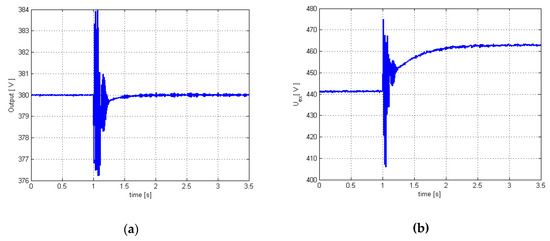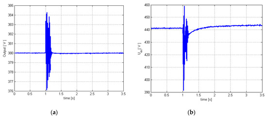 Taking into consideration a reduced 4th order model of the controlled process, the resulting simplified control law also provides very good performance (Figure 12a,b and Figure 11a–c): short settling time (0.18 s, see second yellow point in Figure 11b), short overshoot (4.2 V, see Figure 12a), short oscillating regime (under 0.2 s, see Figure 11b) and reasonable maximum controller output (460 V, see Figure 12b). Overall, the performances are very close (negligibly weaker) to those provided by the control law from the previous case.