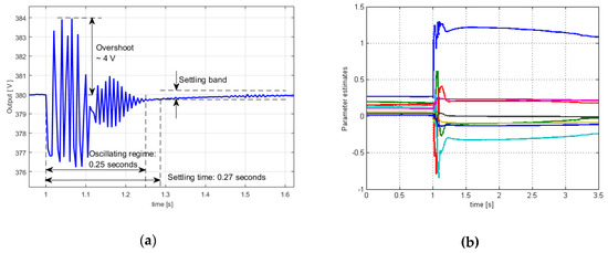 Figure 5a shows a zoom on the controlled output (terminal voltage). A long settling-time (1.6 s) can be noticed, an overshoot slightly over 4 V, and a short oscillating regime (0.2 s). The controller output (excitation voltage) is presented in Figure 4b, and a good penalization of its variance can be noticed. Therefore, the control is in a range of physically achievable values (maximum value of excitation voltage being 500 V). The parameters estimates (outputs of a considered recursive least square estimator (RLS)) are represented in Figure 5b (under action of a stochastic noise with zero mean and variance σ2 = 0.01) and their evolution is numerically stable.