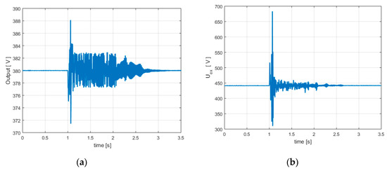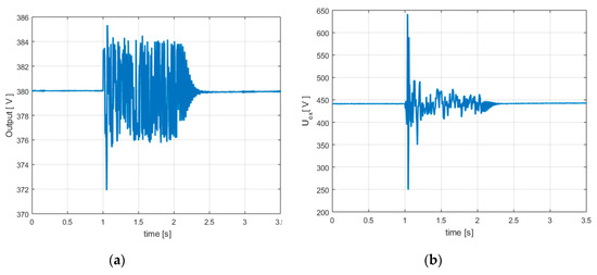 Very poor performances can be observed in Figure 13a,b and Figure 11a–c: much longer settling time (1.3 s, see second yellow point in Figure 11c), small overshoot (over 4.5 V), much longer oscillating regime (1.3 s), maximum excitation voltage over 640 V (Figure 13b). Therefore, the control law designed based on 3rd order linear model has much weaker performances being unable to accurately describe the dynamics of the real controlled process, and as a consequence, the controller is basically under-dimensioned (operating in a forced mode with higher voltage excitation values, but with poor performances). These remarks regarding this low-order control law are also valid both for the case of a resistive load (Case B.3) and the case of a mechanical torque variation (Case A.3). It is also noted that other inductive and capacitive load/unload tests have been carried out, but the conclusions are similar and have not been presented in the paper.