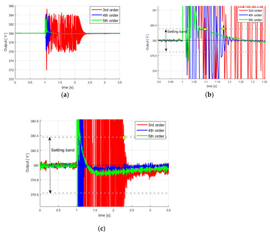 The first case study considers a minimum variance controller designed based on the 5th order linear model. The results (obtained for the same tuning parameters λ = 0.995 and ρ = 0.0725, as in Case A) are depicted in Figure 10a,b and Figure 11a–c. As expected for this higher-order controller, the performances are very good (see also Table 1): short settling time (0.1 s, considering the defined settling band ± 0.1%, see first yellow point in Figure 11b), short overshoot (3.4 V, see Figure 10a), short oscillating regime (under 0.1 s, see Figure 11b) and low maximum controller output (443 V, see Figure 10b).