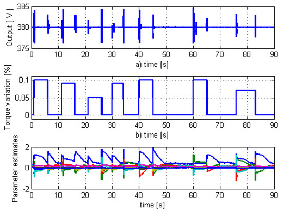 The first case study considers a long sequence of random disturbances (see Figure 14b), generated by repeated variations of the mechanical torque (produced by wind gusts). The process output (terminal voltage) shown in Figure 14a demonstrates the control system robustness and stability. In addition, the numerical stability and convergence of the parameters estimator are proven by the result depicted in Figure 14c.