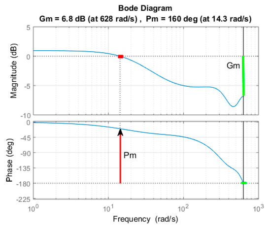 The reserve phase or phase margin (with red color: Pm = 160 deg. at corresponding crossover-frequency 14.3 rad/s) and the gain margin (with green color: positive Gm = 6.8 db. at corresponding frequency 628 rad/s) can be highlighted (see Figure 16). The control system stability can be analyzed based on the phase margin and gain margin. If the conditions 0 < Pm < 180 deg and Gm > 0 are accomplished, then the analyzed system is stable around the functioning point.