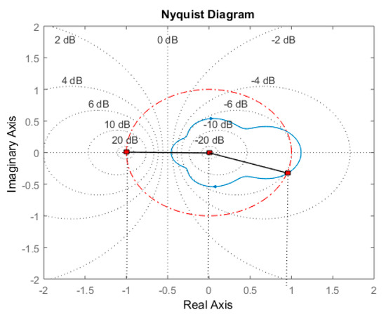 Figure 17 presents the Nyquist diagram of the open-loop system. The Nyquist curve (also known as the sensitivity circle) can also provide information regarding the stability of the closed-loop control system by analyzing the Nyquist diagram of the open-loop transfer function. For this case, the open-loop system is stable (as a series connection of a stable controller and a stable process), it can be noticed that the Nyquist curve does not encircle the critical point (−1,0) (see Figure 17). Moreover, the same phase margin (Pm = 160) can be noticed in the Nyquist diagram (see the phase margin angle Pm with red color in Figure 17). Therefore, the closed-loop system is stable, and so the minimum-variance control system is stable around this operating point.