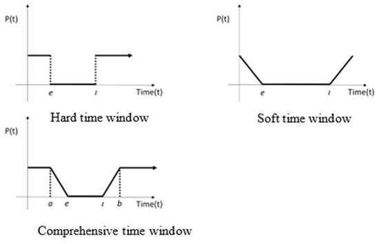 Solomon and Desrosiers [50] proposed a variety of time window concepts when studying scheduling problems and divided the time window constraints into two categories according to the degree of elasticity: the soft time window and hard time window. The main difference is that the hard time window must fall completely within the set time window. Otherwise, the soft time window is allowed to fall outside the time window but it must be punished. The two are mixed into a comprehensive time window. Figure 2 shows the three time window types, where the X-axis is time, the Y-coordinate indicates the cost of substituting the P function and e and ι represent the lower bound and the upper bound of the time window, respectively.