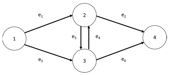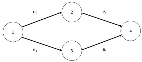 In the network represented in Figure 3, node 1 represents the source node, node 4 represents the sink node, nodes 2 and 3 represent the transit nodes through which the transport process passes and is taken as an example. A summary table that explains the topics step by step has been provided on Table A2 in the Appendix A. The arc represents the transport path. The basic data of each arc, the fuzzy function of each arc flow and time and the fuzzy function value of each arc reliability are shown in Table 1, Table 2 and Table 3.