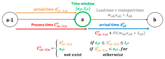In order to define the time windows of all paths separately, before the time for calculating each solution, all the time window routes in each solution are proposed for calculation and they are arranged in v routes, as shown in Figure 4. In the time window, the time includes the lead time, transit time, process time and arrival time. This study set the process time to Cva,b, which means the current accumulated time. Equation (8) is the assumed time of the source node; here we set the starting time as 0.