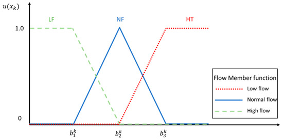 In order to express the relationship between traffic and reliability in the traffic network, this study used the concept of fuzzy sets to express the extent to which element x belongs to set A [28]. This study set the path flow to x and defined three fuzzy set states A for each path: low load (low flow), normal load (normal flow) and high load (high flow). After defining the fuzzy set, we constructed a fuzzy system by using the fuzzy rule base, fuzzy inference and defuzzification, we used this system to find all path reliability and finally calculate the overall network reliability.