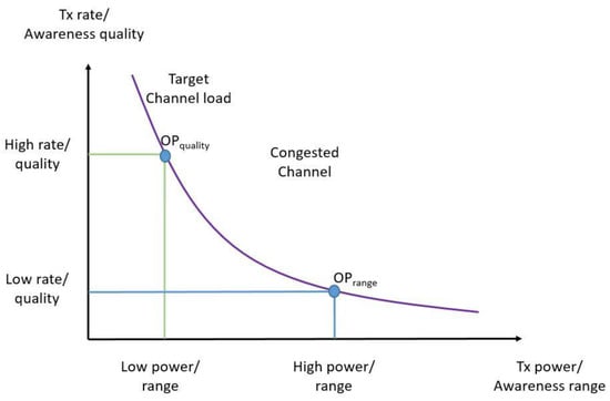 The ultimate objective for congestion control is to improve the awareness of the vehicles. Decreasing the Tx power or rate may mitigate congestion, but lowers the quality of awareness. Conversely, increasing the awareness by transmitting with maximum Tx power and rate increases congestion. As indicated in [85], Tx power and rate are inversely correlated at constant target load on the wireless channel, i.e., decreasing the Tx power allows an increase in the Tx rate and vice versa. The approaches discussed so far can only set one single power/rate pair, which results in the transmission power/rate trade-off dilemma [30], as shown in Figure 3. To fulfill the awareness range requirement () by increasing the power, the rate has to be reduced, failing to achieve the required quality. On the other hand, to fulfill the quality requirement () by increasing the rate, the power has to be reduced, failing to achieve the required awareness range. To overcome this limitation, some joint power/rate congestion control approaches have been proposed. These approaches [30,75,86,87], attempt to jointly adjust rate and power to achieve the required level of awareness for all neighboring vehicles.