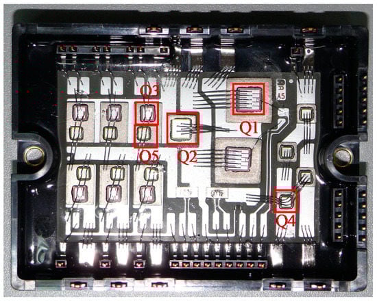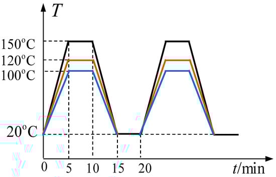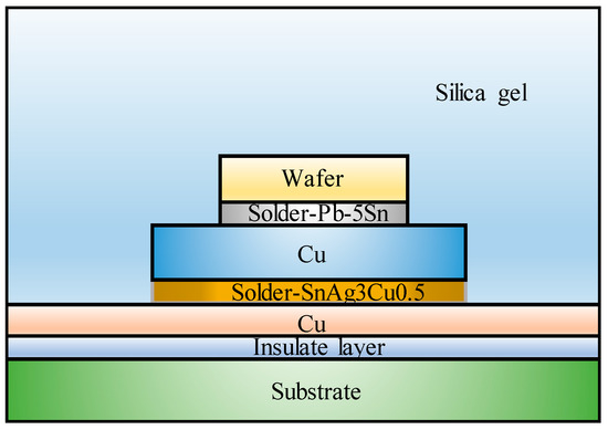 The chipset shown in Figure 1 has nineteen pieces of chips, including two pieces of chip Q1, one piece of chip Q2, six pieces of chip Q3, four pieces of chip Q4, and six pieces of chip Q5. The structure of every chip is similar and the specific dimensions of a single chip are shown in Figure 2. The materials shown are the wafer (silicon), solder Pb-5Sn, Cu, solder SnAg3Cu0.5, Cu, insulate layer, substrate, and silica gel. The silica gel protector is cleaned and then the chipset is cut out by a wire cutter. Five types of chips are then put into a same temperature box to undergo cyclic thermal charge, as shown in Figure 3, with a temperature amplitude of 20–150 °C, 20–120 °C and 20–100 °C, respectively.
