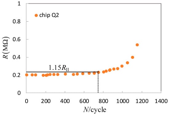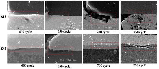 As the damage or crack in the chip cannot be observed directly, the fatigue life limit has to be defined first. To detect the fatigue failure, the electric resistance of the chips is measured by a digital resistance meter for a certain interval. Figure 4 depicts the typical electric resistance variation of chip Q2 with the thermal cycles (20–150 °C). Figure 5 gives the SEM observation of crack nucleation at the interface of the wafer and solder Pb-5Sn (interface S12), and solder SnAg3Cu0.5 and Cu (interface S45). It is found that the main crack forms first from S45. By comparing the forming of the main crack at S45 and the electronic resistance increase (RI), we define the fatigue life limit Nf by RI reaching 15% []. Using this method, we determine the average thermal fatigue lives of five types of chips under different experimental conditions, as listed in Table 1.