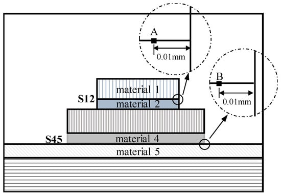 An unsteady thermal conduction analysis and thermal stress analysis were carried out with the corresponding chips. The FEM model of chip Q2 is shown in Figure 6, where the total number of elements is 78,890, the number of nodes is 85,200, and the smallest element size at the interfacial singular zone is 0.00001 mm × 0.00003 mm × 0.00003 mm. The convergence analysis was conducted to ensure the accuracy of our results, as well as the computational efficiency. In the thermal conduction analysis, the surrounding temperature variation is exactly the same as that in the thermal fatigue tests. To express the stress and strain singularity at the edge of the interface between the solder and substrate, specific points at the edges S12 and S45 are selected, as shown in Figure 7. The typical stress and equivalent strain variations with time at point A and B are shown in Figure 8 and Figure 9. The stress near the interfacial edge varies for the first several cycles, but after three cycles it is saturated. The most severe case does not occur at the initial or stable stage, but at the stage of heating. In this case, the normal stress on interface S12 is compressive, and in conclusion, the shear stress is the dominant factor of interface failure. At S45 the maximum traction σt = (σ2 + τ2)1/2 dominates interface failure because the normal stress is tensile.