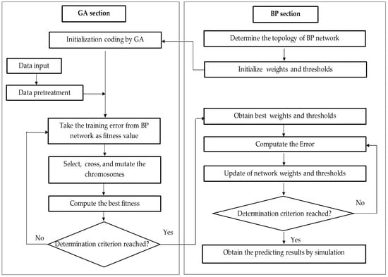 The main idea of GA-BP hybrid programming is to optimize the weights and thresholds of the BP network based on the GA. Real coding is used to evolve the weights and thresholds of the network. Firstly, the fitness function is determined, then the evolution process (the global search operator of the algorithm, such as the selection, crossover and mutation operator) is selected. Lastly, the GA searches for the optimal weights and thresholds in the whole solution space. The algorithm flow chart of a real coding genetic algorithm combined with a neural network is shown in Figure 14. In essence, the main role of the GA is to optimize the initial weight distribution and locate some better search spaces in the solution space, which facilitates the BP algorithm’s search for the optimal solution in these small solution spaces. Generally, the efficiency of the GA-BP hybrid training is superior to BP training alone.