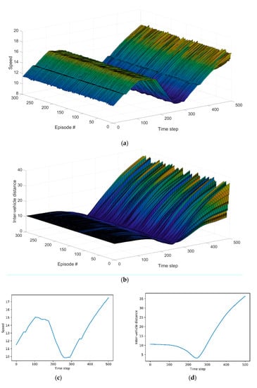 Figure 7a presents speed profile of the host vehicle in all episodes. It is not special in the initial time step. The host vehicle travels at various speeds as the lane change is over. Figure 7b shows inter-vehicle distances in all episodes. Figure 7b shows a pattern similar to Figure 7a, Figure 7c,d correspond to the highest reward, and Figure 7e,f depict the lowest reward. We can observe the relationship between speed and inter-vehicle distance in both cases. As inter-vehicle distance between the host vehicle and the remote vehicle decreases, the host vehicle reduces the speed to avoid collision. Conversely, as the inter-vehicle distance increases, the host vehicle does not maintain a reduced speed but increases the speed through acceleration.
