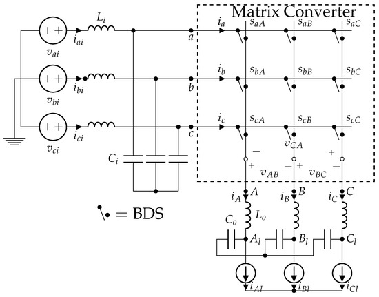 The direct matrix converter is a power electronics topology that efficiently carries out the AC-AC energy conversion without intermediate stages. This converter utilizes solid-state power devices and a minimum of energy storage elements, only for filtering purposes; besides, it incorporates beneficial characteristics, viz., bidirectional power flow, compact structure, high-quality low-frequency signals, and a unitary power factor operation, among others [1,2,3]. Direct MC is composed of an array of nine Bi-Directional power Switches (BDS), which are its main power components, as can be seen in Figure 1.