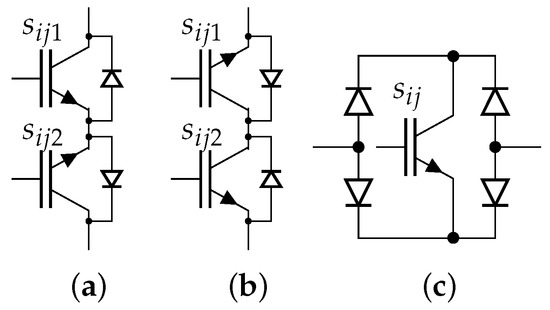 The BDS is an idealized element with the ability to block voltage and conduct current in both directions. A near-ideal behavior can be achieved by the junction of silicon devices like diodes and power transistors. Figure 2 shows the common topologies used to implement a BDS through Insulated Gate Bipolar Transistors (IGBT).