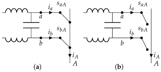 The MC operates from the proper manipulation of the commutation logic of nine BDS (), which make up the matrix (S). In the MC, each BDS links any of the three input voltages to each one of the three output voltages (see Figure 1). At any time, in each column of the MC, only one switch must be closed to ensure a safe operation. This is represented by Equation (1).