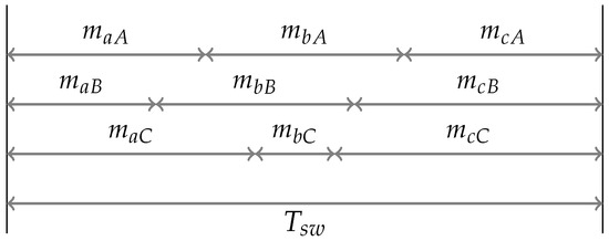 where and , for and . Additionally, the vectors included in Equation (1) are the following: input currents, = , output currents, = , input voltages, = , and output voltages, = . Through an adequate modulation strategy, a desired output voltage is generated, where the MC reaches a maximum voltage ratio of / = , for a floating output voltage [26,27]. Among the modulation techniques, duty-cycle modulations present many interesting features. In these schemes, matrix S of Equation (1) is represented by the averaged values of the elements, taken over a constant switching period. In this sense, Equation (1) can be rewritten as in Equation (2), on which are applied the same considerations indicated above for elements . The objective of the modulation technique is to determine the matrix by solving the problem described by Equation (2); considering that the input voltages, , and output currents, , are known, and that the output voltages, , and input currents, , are the established reference signals.