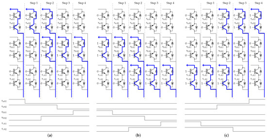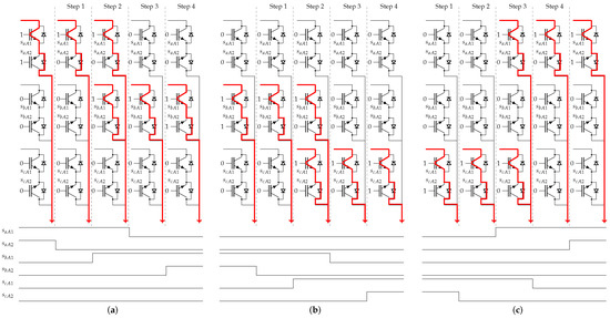 Figure 5 presents a single-side switching pattern, where it can be observed that over a certain commutation period , each BDS is active (“on”) during a predefined time given by . Each transition between a pair of BDS is carried out through the four-step current commutation process, as depicted in Figure 6 and Figure 7. The signals involved in the commutation process between each pair of BDS of the MC first column are presented in these figures. Considering the first case presented in Figure 6, where is the off-going and is the on-coming BDS, the four-step commutation process can be explained as follows: (i) in the first step, the non-conducting switch of the off-going BDS is turned off; (ii) then, the on-coming conducting switch is turned on (second step); (iii) in the third step, the off-going conducting switch is turned off; and (iv) in the final step, the on-coming non-conducting switch is turned on. As stated before, the commutation logic depends on the electrical current direction, as can be seen in Figure 6 and Figure 7 previously discussed.