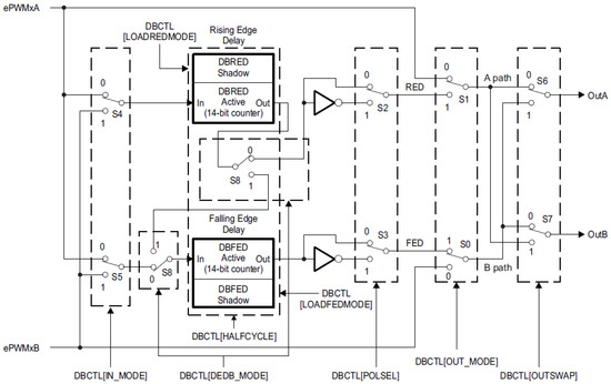 Each ePWM module is utilized to control one BDS, ; thus, three ePWM modules are required for operating a single column in the MC. In this sense, a total of nine modules is required to control the complete MC. For the first column, three ePWM modules were used, identified as 1, 2, and 3. The clock in these modules was configured to execute the count-up from zero until reaching the value established in the PRD register, generating a saw-tooth signal. Comparing these signals with the values set in the registers CMPA, CMPB, PRD, or the ZERO value, the desired output signals can be obtained once the counters have reached one of these values. Output signals can be set at a high-level (set) or low-level (clear). Each ePWM module provides two output signals, ePWMxa and ePWMxb, which are directly assigned to each transistor of the BDS. These last signals can be configured to maintain the time delay required in the four-step algorithm, through the dead-band submodule shown in Figure 8. In this device, the dead-band time is configured by the registers FED and RED, and once the ePWM has been properly configured, the respective outputs ePWMxa and ePWMxb can be exchanged through the register DBCTL[OUTSWAP] (DBO) [30]. The latter is an essential feature for the implementation of the four-step algorithm. Additionally, the ePWM module has two registers, CMPC and CMPD, which can be used as sources of flags and interruptions.