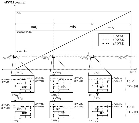 Finally, ePWM3 is configured to control the BDS ; in this case, the module is activated while the value of the counter is higher than ( + )*PRD + FED/2, and it remains in that state until the PRD value is reached. The above is achieved by configuring the CMPA register with the value ( + )*PRD + FED/2 (), and similarly to the signal, the signal is reached when the counter is equal to the value in the register PRD (). The process of generating the switching signals for the ePWM1, ePWM2, and ePWM3 modules, under the four-step commutation strategy, is graphically represented in Figure 9.