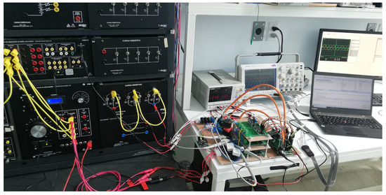 In order to verify the effectiveness of the proposed algorithm, a prototype of the three-phase direct matrix converter (Figure 1), was implemented. The MC experimental setup was built using the HGT1S1260A4DS IGBTs, and for the input and output filter, the following elements were utilized, (mH), (F), (mH), and (F). Finally, a resistor of 170 () was connected to each of the MC output terminals as electrical load. The corresponding gates of the IGBTs were triggered by a pulse of (V) through the HCPL-3120 gate-driver. Figure 10 illustrates the complete experimental test system. The four-step commutation strategy along with the SVD modulation technique were implemented in the TMS320F28379D device. The 32-bit floating-point CPU of the MCU has a Trigonometric Math Unit (TMU) accelerator, which allows evaluating the matrix of Equation (2) in a time inferior to 5 [s].