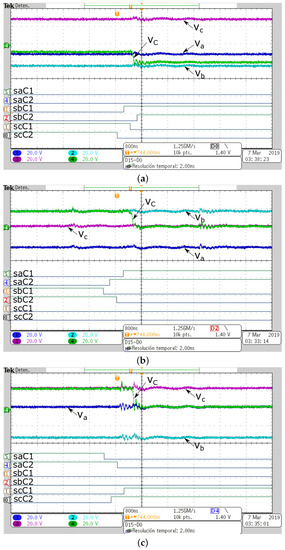 Figure 11a–c presents the signals involved in the commutation of the MC third column, namely, the input voltages (), the output voltage , and the gate signals obtained from the implemented four-step commutation strategy. In this case, input voltages , , and were sequentially applied to output voltage , during periods of time established by , , and , respectively. Figure 11a illustrates the case when a transition between BDS and occurs, which means that the output voltage at MC phase C () passes from being equal to the input voltage () to be synthesized by the phase b input voltage (). This figure also illustrates the control signals generated for the six switches that make up the three BDS of the MC third column, allowing one to appreciate the four steps required to achieve the commutation.
